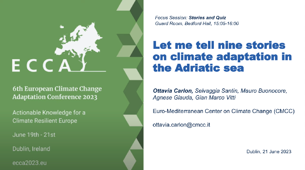 The climateliteracy.eu interactive platform on Climate Literacy developed by CMCC within the Adriaclim project was presented at the 6th European Climate Change Adaptation Conference (ECCA) in Dublin on June 21, 2023. The presentation, titled “Let me tell nine stories of adaptation in the Adriatic Sea” was held by Ottavia Carlon (CMCC) in the Focus Session “Stories and Quiz”. The European Climate Change Adaptation conference is biannual and is convened by projects that have received funding from the European Union’s Horizon 2020 Research and Innovation Framework Programme.