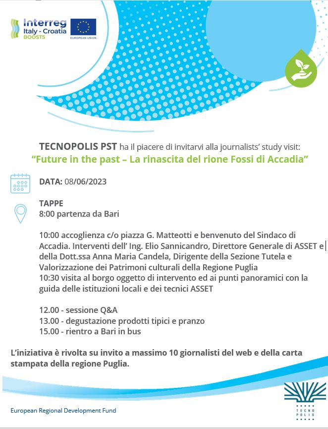 The study visit for journalists of the historic village Rione Fossi di Accadia (Foggia) is scheduled for 8 June 2023 (8 a.m.-3 p.m.), organized by Tecnopolis, in cooperation with ASSET Puglia.