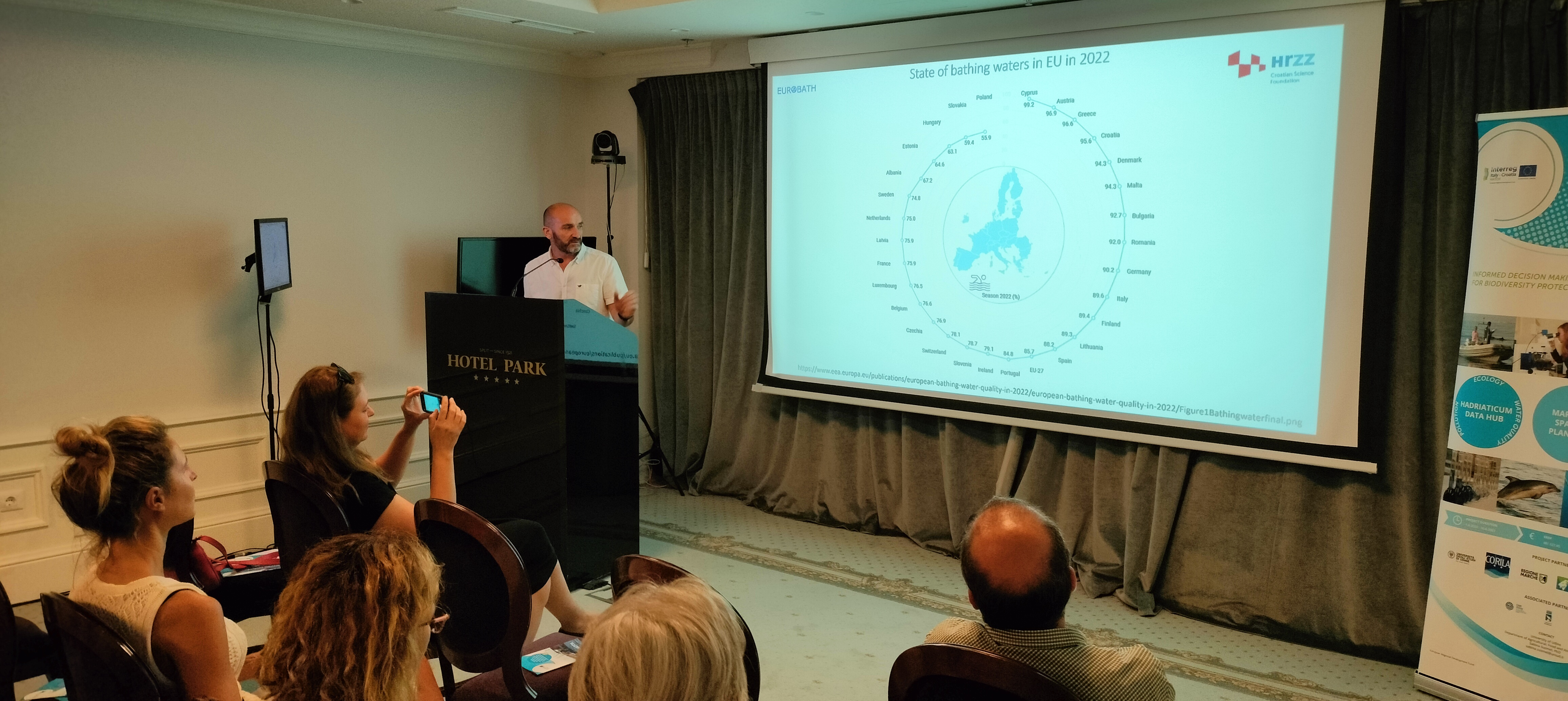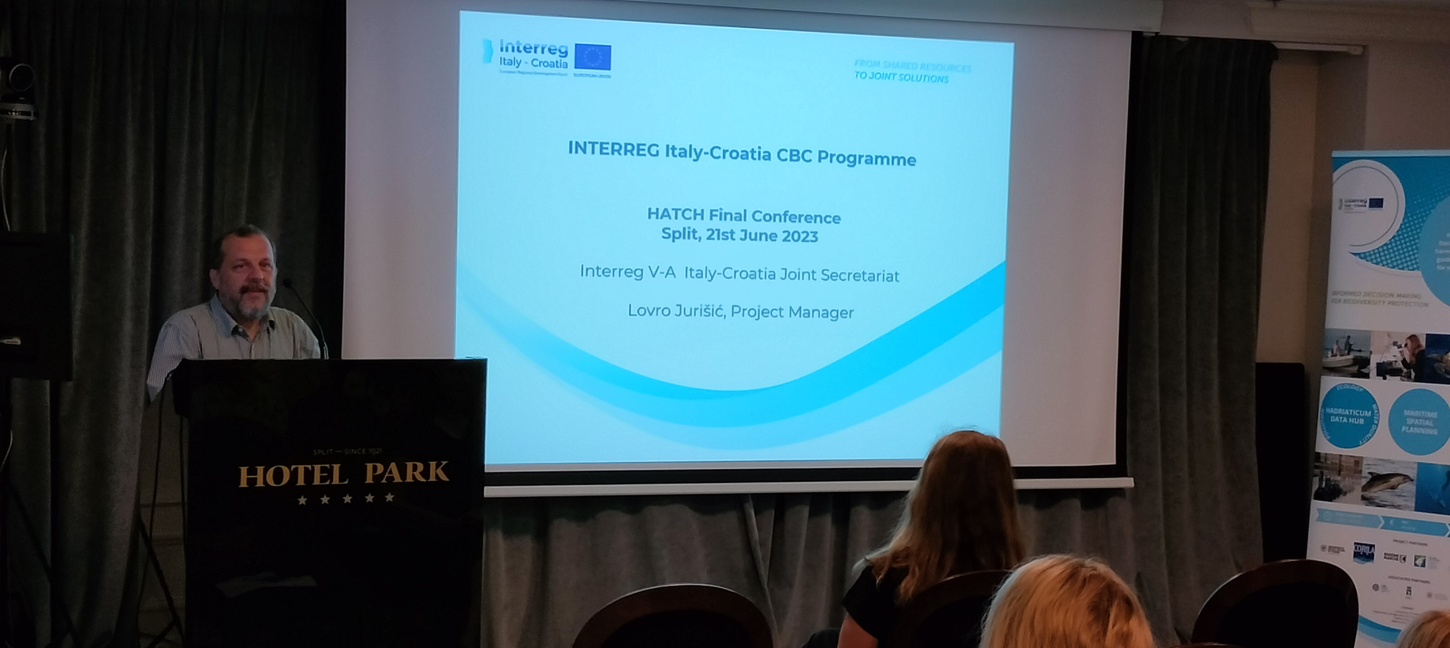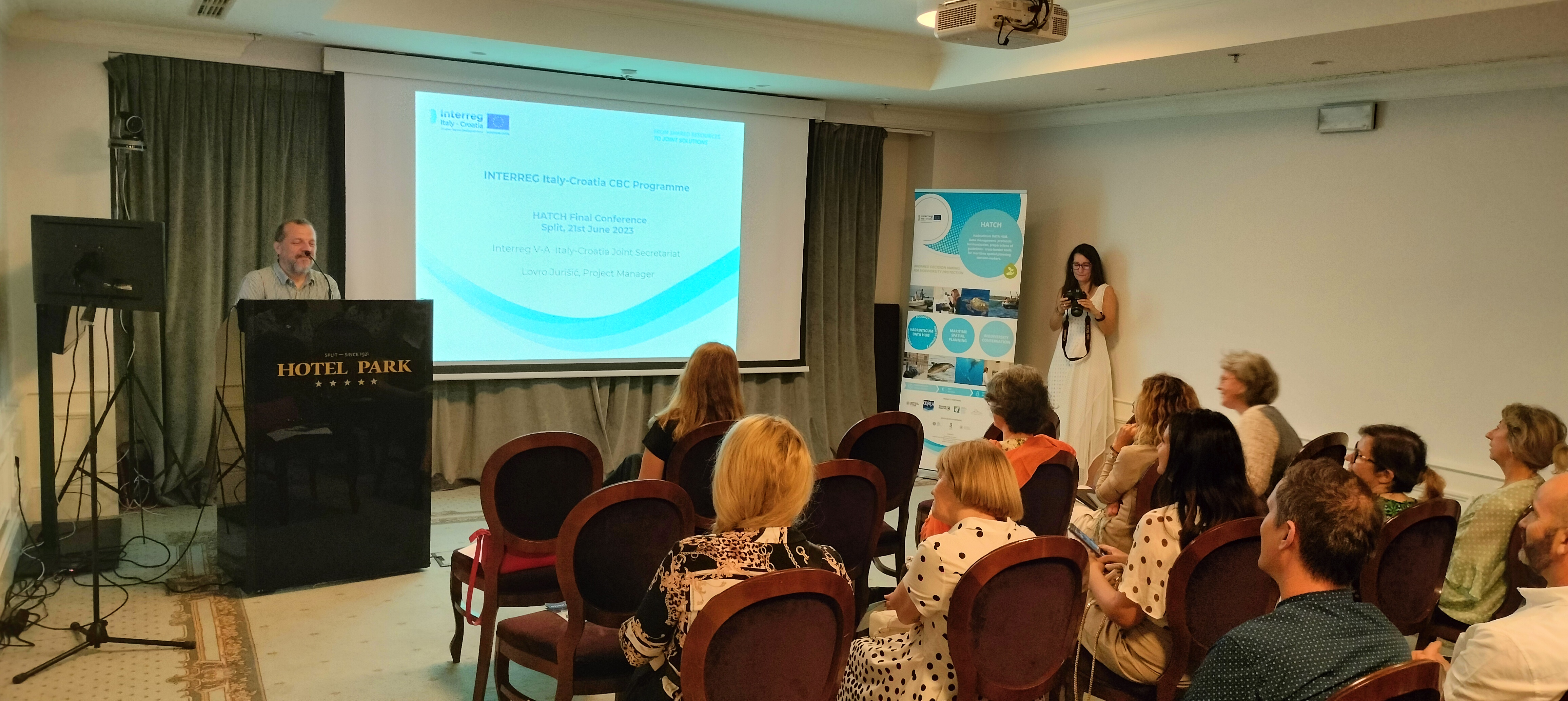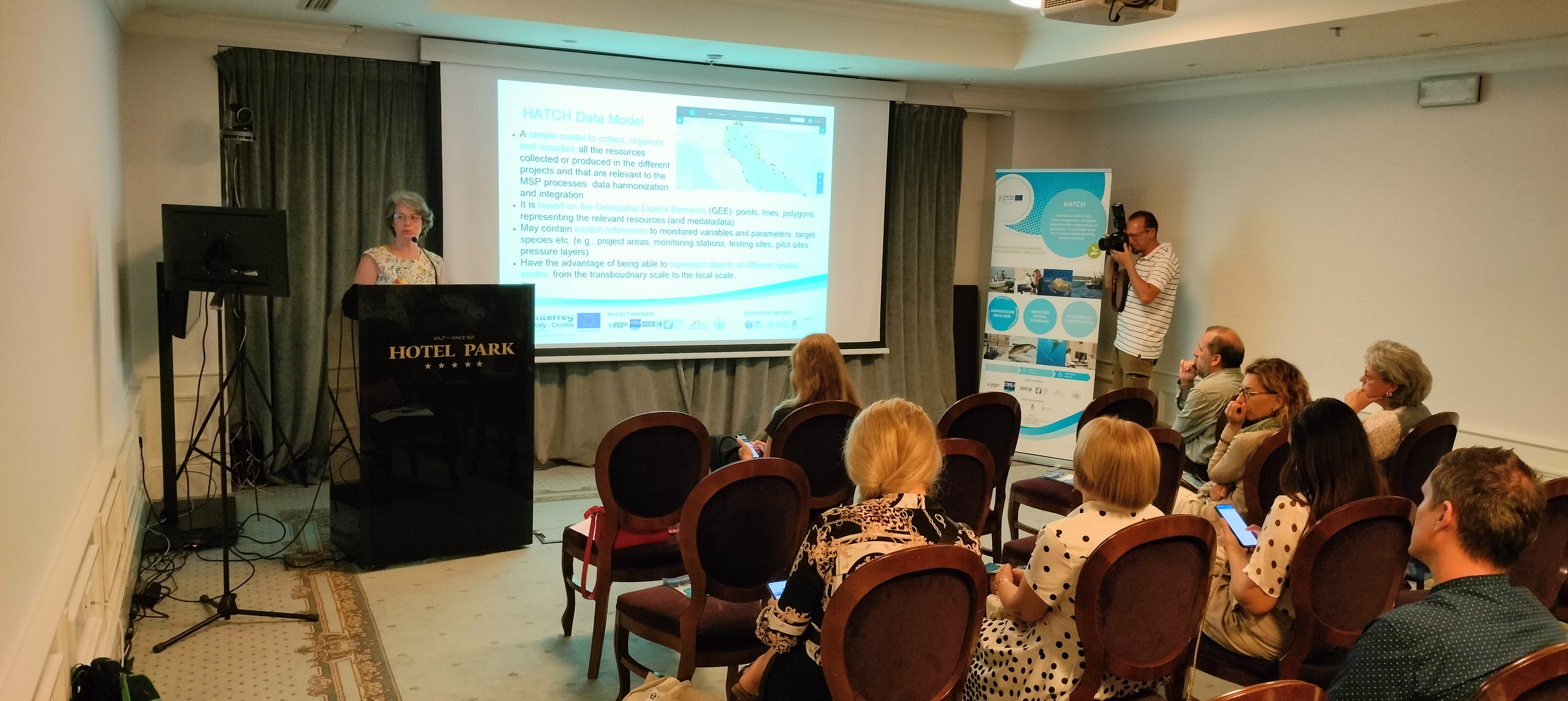 Maja Krželj from the University Department of Marine Studies of the University of Split opened the conference with a welcome speech. Following this, Lovro Jurišić from the Joint Secretariat presented the next funding period of the Interreg Italy-Croatia 2021-2027 Programme. A short overview of the HATCH project was given by Sabina Susmel from the University of Udine, lead partner of the project. The core result of the project, the Hadriaticum Data Hub geoplatform was presented by Caterina Dabala from CORILA, whereas Grgur Pleslić from BWI presented the communication activities and stakeholder engagement.