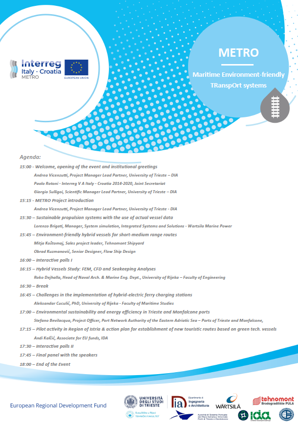 The goal of METRO (Maritime Environment-friendly TRanspOrt systems) project is the improvement of the environmental sustainability of tourist maritime transport in the North Adriatic, addressing some specific challenges of the area: more integrated, efficient and sustainable maritime connections between Italy and Croatia; reduction of traffic congestion caused by seasonal tourist flows; improvement in local stakeholders competitiveness.