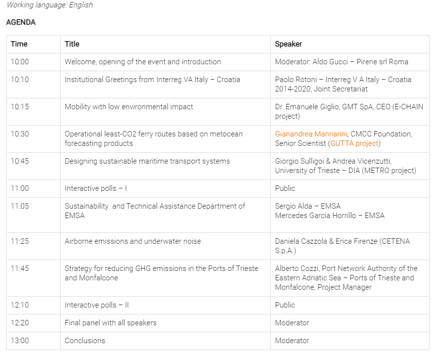 In a compact online event, three research projects of the IT-HR Programme will dialogue to address this question. Representatives from the E-CHAIN (enhanced connectivity and harmonization of data for the Adriatic intermodal network), GUTTA (saving fuel and emissions from maritime transport in the Adriatic region), and METRO (maritime environment-friendly transport systems) will describe the outcomes of the project activities and the experiences learned during the projects. Furthermore, thanks to the participation of speakers from regulatory agencies, policymaking, industry, etc, insights about the present and the future of maritime transport regarding sustainability actions will be provided.