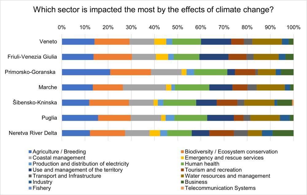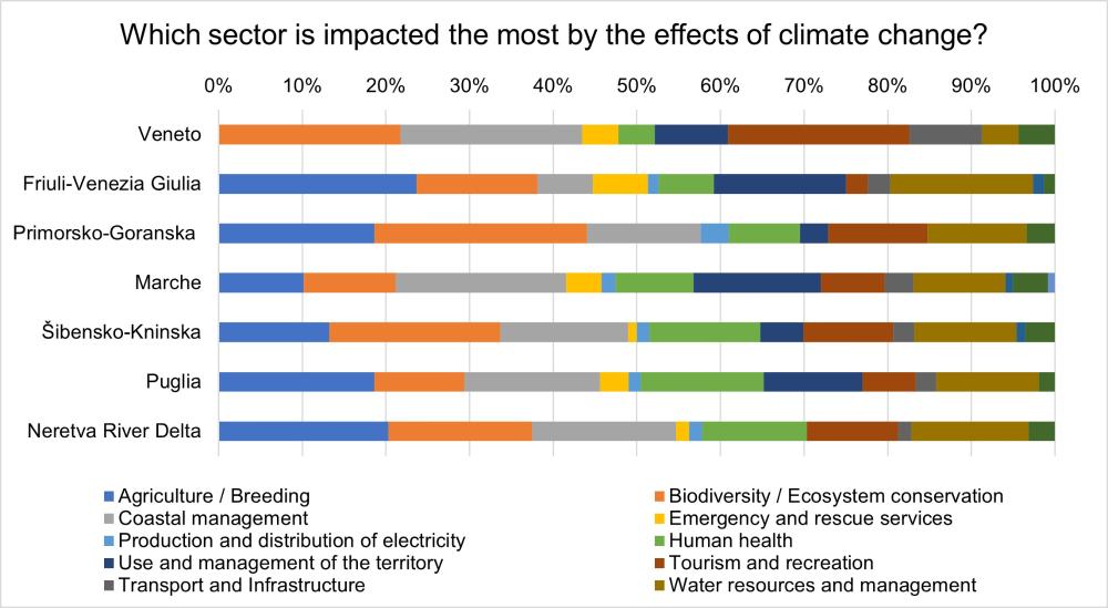 More diversified are the results about the perceived sectors that will be impacted by the effects of climate change. In Northern Adriatic, in Friuli-Venezia Giulia Public Authorities are more concerned for agriculture and breeding and the population is more concerned for biodiversity and ecosystem conservation. In Veneto the population is more concerned for biodiversity and ecosystem conservation, whereas Public Authorities are also concerned for coastal management and tourism and recreation. In Primorsko-Goranska Public Authorities are more concerned for biodiversity and ecosystem conservation and the population is more concerned for agriculture and breeding. In Central Adriatic, in Marche both Public Authorities and the population show the main concern for coastal management, whereas in Šibensko-Kninska both Public Authorities and the population show the main concern for biodiversity and ecosystem conservation. In Southern Adriatic, in Puglia both Public Authorities and the population show the main concern for agriculture and breeding, whereas in Neretva River Delta Public Authorities are more concerned for agriculture and breeding and the population is more concerned for biodiversity and ecosystem conservation.