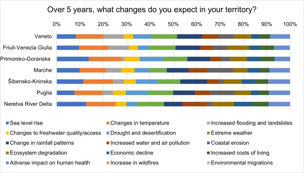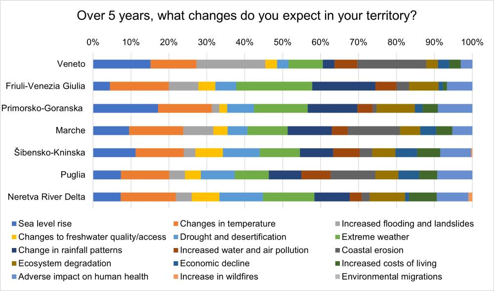 Results are presented for each pilot area and specifically show that local stakeholders are aware of the current climatic crisis and of the role of human activities in determining the effects. Citizensin each pilot area agree that the main effect of climate change will be changes in temperature, while Public Authorities also consider significant (i) extreme weather, (ii) sea level rise, (iii) increased flooding and landslides and coastal erosion.
