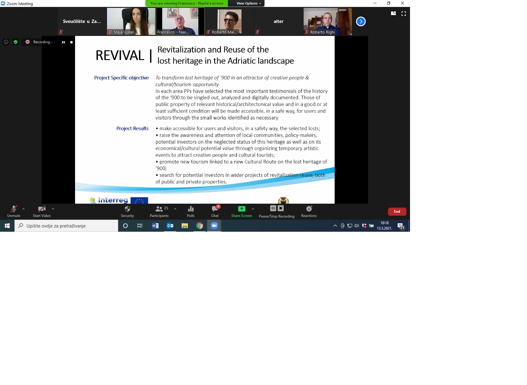 The event was took place 13th May 2021 on-line due epidemical situation. Main objective of the event was exchangeing experiences on revitalization of lost heritage. PI RERA SD organized REVIVAL Dissemination event together with TEMPUS project in accordance with JS initiative EU Next Adriatic Initiative. Even in on-line format, event was very frutiful and resulted with many different and creative approches for reuse of the forgotten spaces. Event was an important occasion to network with TEMPUS project which has similar thematic and all invited stakeholders which represented an example of best practices for revitalization of lost heritage.. All interesting presentations can be founded at REVIVAL YouTube official pages.