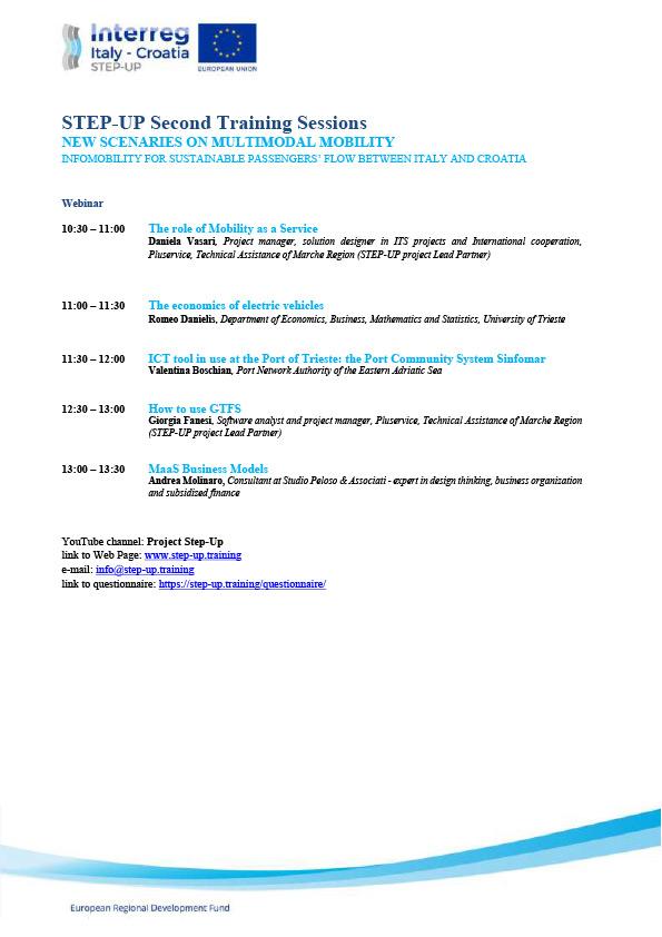 The webinar is organised as the second Training Session of STEP-UP project, INTERREG ITALY-CROATIA funded by the European Regional Development Funds. The webinar aims to promote the knowledge of the fields of tourism, multimodality and ICT systems applied to passenger flows, and bring attention to development projects involving the Adriatic area between Italy and Croatia.